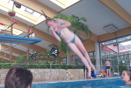 6 Jahren. Die erste Rutsche war Blau sie hatte viele Kurven und einen Zwischenbereich. Die zweite Rutsche war sehr breit und hatte auch viele Kurven. Die dritte Rutsche war schwarz und beim rutschen sah man nichts und an einer Stelle ging es steil herunter. Die vierte Rutsche war eine Loopingrutsche, wo man sich hineinhängen musste und dann musste man loslassen und fiel ca. fünf Meter, bis dann der Looping kam. Beim Wellenbad gab es eine Verbindung zum Strudel der leider defekt war . Bei dem großen Becken gab es einen 1 Meter Turm und einen 3 Meter Turm. Einmal sind alle hintereinander hergesprungen. Das war sehr witzig und dann haben alle gesungen.
