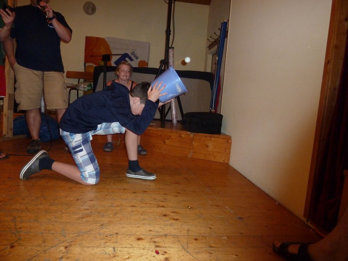 Moderatoren durften Jakob, Olli, Basti und Jule mit einem Luftballon alle Becher abräumen. Jakob hatte genug Puste