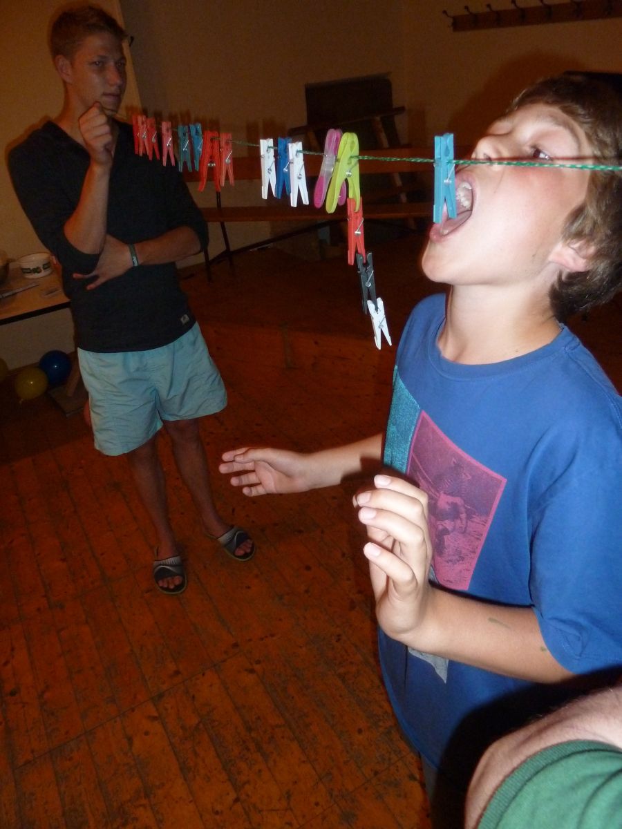 Wäscheklammerlimbo? Aber sicher! An einer Leine angehängte Klammern mussten mit dem Mund nach und nach zu