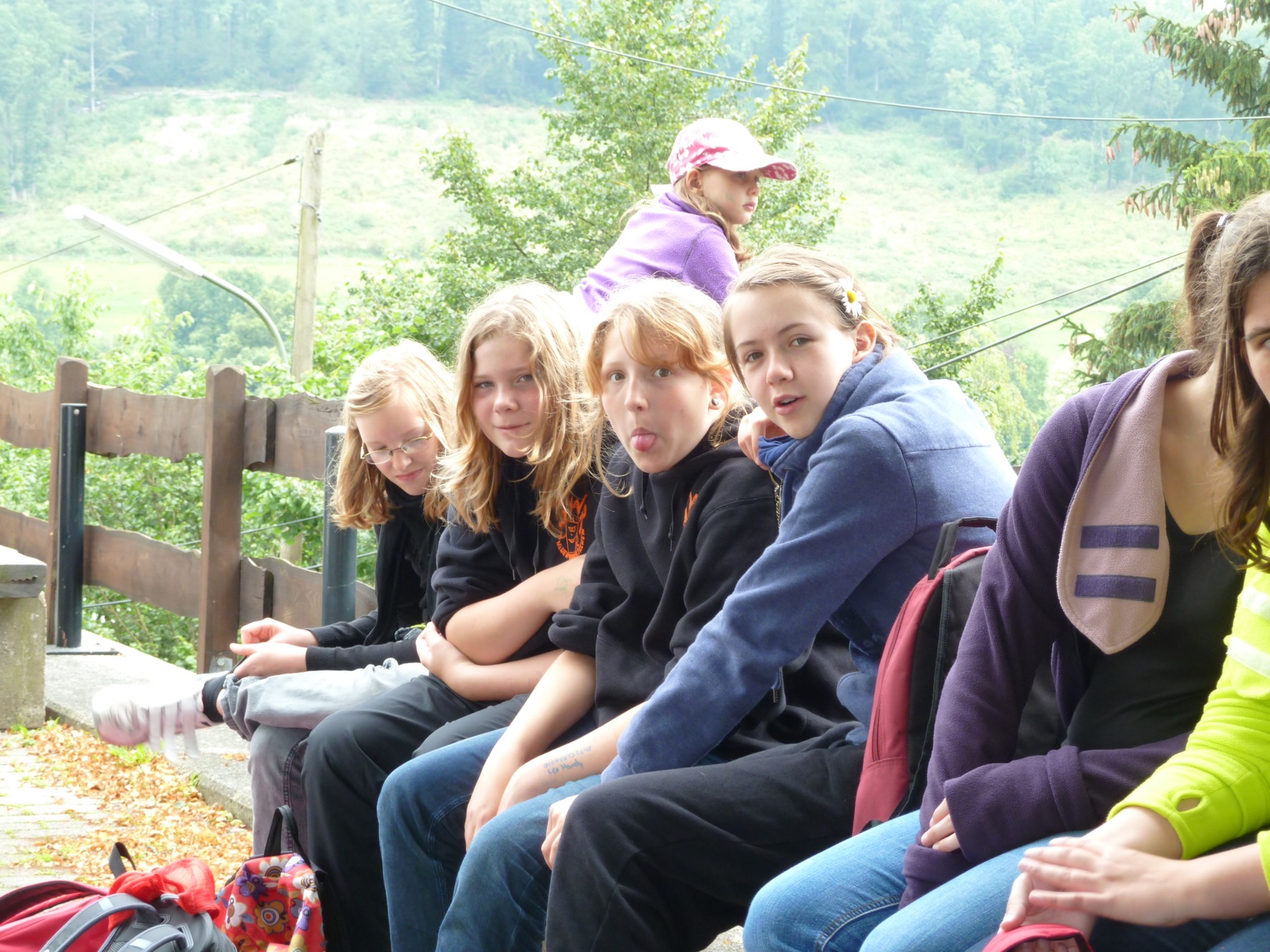 Nun mussten wir auf der Karte eine geeignete Stelle zum Feuer machen suchen. Bevor wir dorthin losgezogen sind, gingen wir am Sportplatz vorbei, da dort ein anderes Ferienlager war. Wir dachten, dass wir dort vielleicht mit Essen dürfen. Als wir dort ankamen, wurden wir mit seltsamen Blicken begrüßt. Deshalb beschlossen wir, mit lautem Singen („Das Wir St. Arnolder sind Halli, Hallo..) weiter zu gehen. An einem Hotel machten wir eine kurze Pause, dort bekamen wir noch mal eine Flasche Wasser und die Mädchen hatten die Gelegenheit zur Toilette zu gehen.