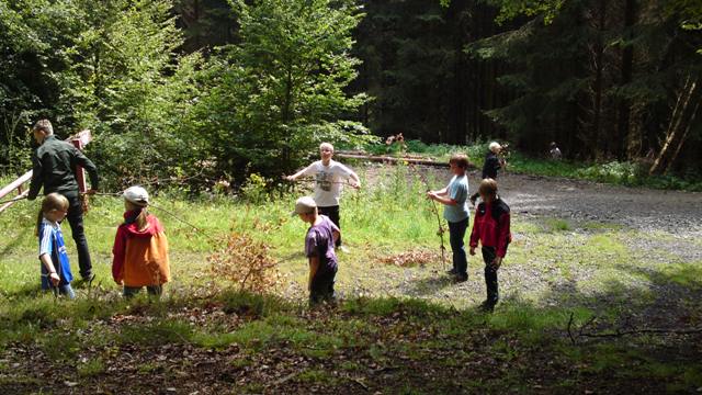 Dann ging es weiter Richtung Wald. Die Stimmung hätte nicht besser sein können. Immer wieder fing einer an mit Liedern wie „Einmal fuhr ein Omnibus“ oder „Ein Fahrradlenker“, und alle machten mit. Der Boden war noch etwas nass, da es an den vorherigen Tagen geregnet hatte. Als wir unsere Feuerstelle erreichten, sammelten wir Holz und Steine dafür.