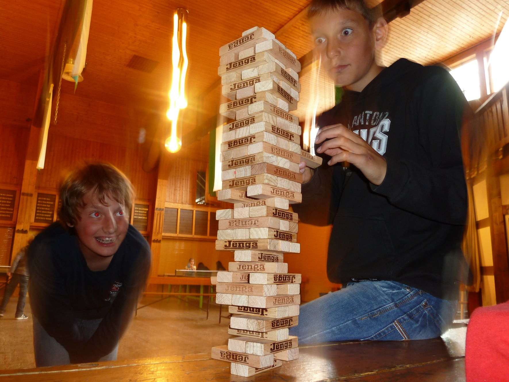 Jan und Jakob spielen Jenga und Kopf und Kragen, direkt daneben werden meterlange Dominoketten aufgebaut, Vorsicht bitte!